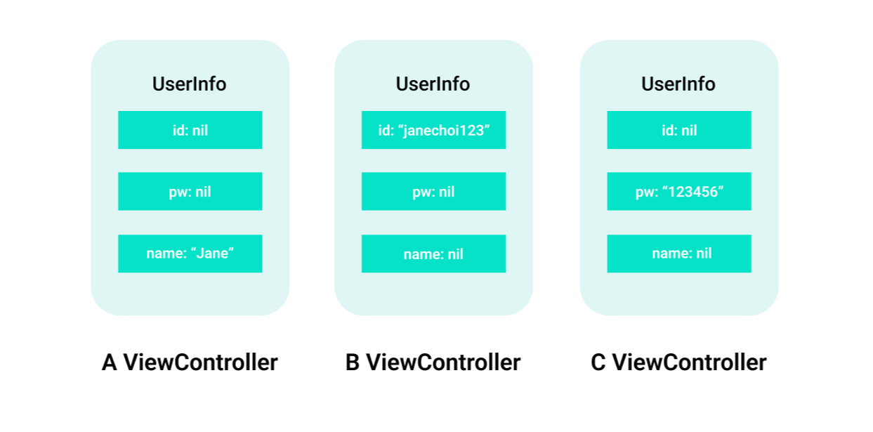 μμ κ°μ΄ μΈ κ°μ Viewcontrollerμμ UserInfo κ°μ²΄λ₯Ό κ°κ° λ°λ‘ μμ±νμ¬ id, pw, name μ 보λ₯Ό μ μ₯νκ²λ©λλ€.