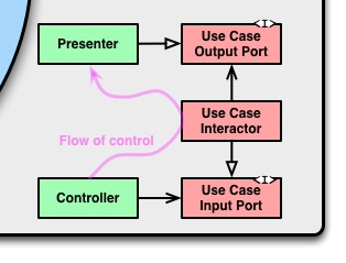 Use Case๊ฐ ์์ชฝ ์์ ์๋ ์ธํฐํ์ด์ค(= Use Case Output Port)๋ฅผ ํธ์ถํ๋๋ก ํ๊ณ ๋ฐ๊นฅ์ชฝ ์์์๋ Presenter์๊ฒ ์ด๋ฅผ ๊ตฌํํ๋๋ก ํ๋ ๋ฐฉ์์ ํตํด ์ํ๋ ํ๋ก์ฐ๋ก ์คํ์ด ๊ฐ๋ฅํฉ๋๋ค. ์ด๋ ๊ฒ ํ๋ฉด ๋ฐ๊นฅ์ชฝ ๋ ์ด์ด์ธ Presenter์ ๋ํด ๋ชฐ๋ผ๋ ์ธํฐํ์ด์ค๋ฅผ ํตํด ์ ๊ทผ์ด ๊ฐ๋ฅํ ๊ฒ์ ๋๋ค. (iOS์์๋ ํ๋กํ ์ฝ๋ก ๊ตฌํ ๊ฐ๋ฅ)