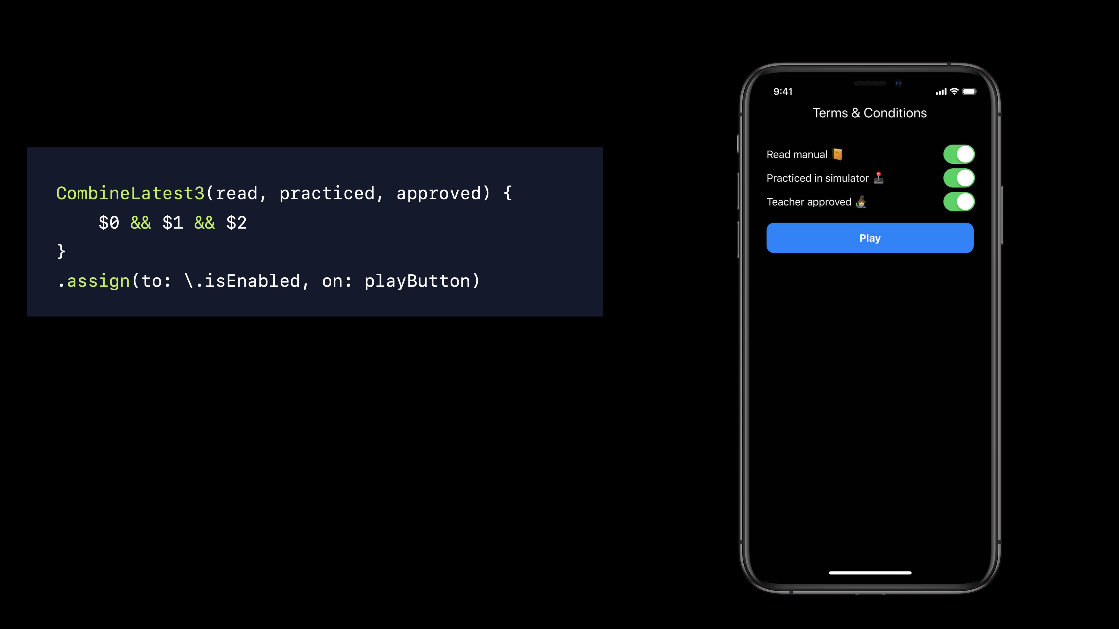 3๊ฐ์ ์ ์คํธ๋ฆผ์ ์ฌ์ฉํ๋ CombineLatest๋ฅผ ์ฌ์ฉํ์ฌ ํ ๊ธ ์ค์์น์ ์ํ๊ฐ์ ๋ฐ๋ผ play ๋ฒํผ์ ํ์ฑํ ์ฌ๋ถ๋ฅผ ๊ฒฐ์ ํ๋๋ก ํ ์ ์์ต๋๋ค.
